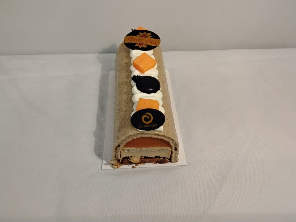 Bûche Abricot Spéculoos Sablé diamant reconstitué, biscuit pâte à chou cannelle, compotée d’abricot, crème mousseuse Spéculoos. Bûche 4 personnes: 13,40€ Bûche 6 personnes: 20,10€ Bûche 8 personnes: 26,80€